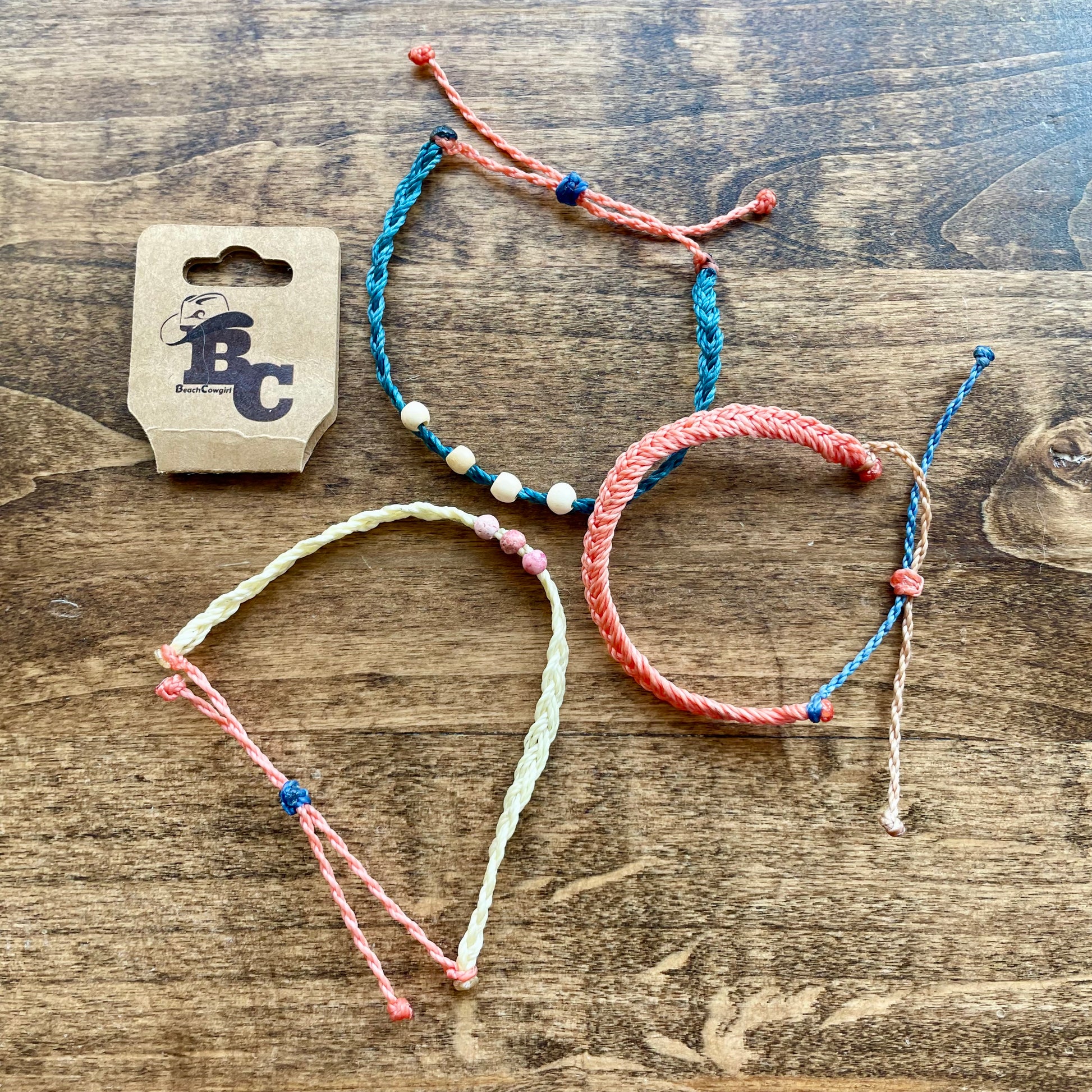 Three matching bracelets in this set! Cute beads and great colors! Fully adjustable and wax coated for a long lasting life!
