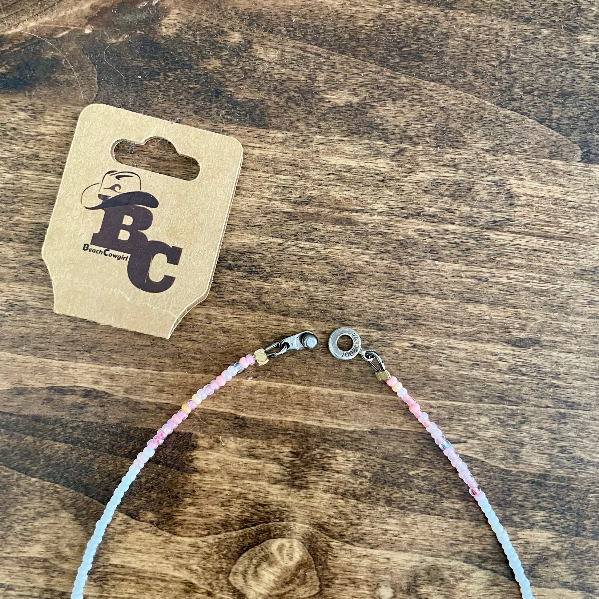 Beautiful handcrafted necklace! Made with stainless steel wire for extra durability and completely waterproof! Never have to take your jewelry off again! This necklace is made with little blue, pink and white beads with a super cute gold heart pendant! It has a unique button clasp that makes for easy on and off! 16 in.