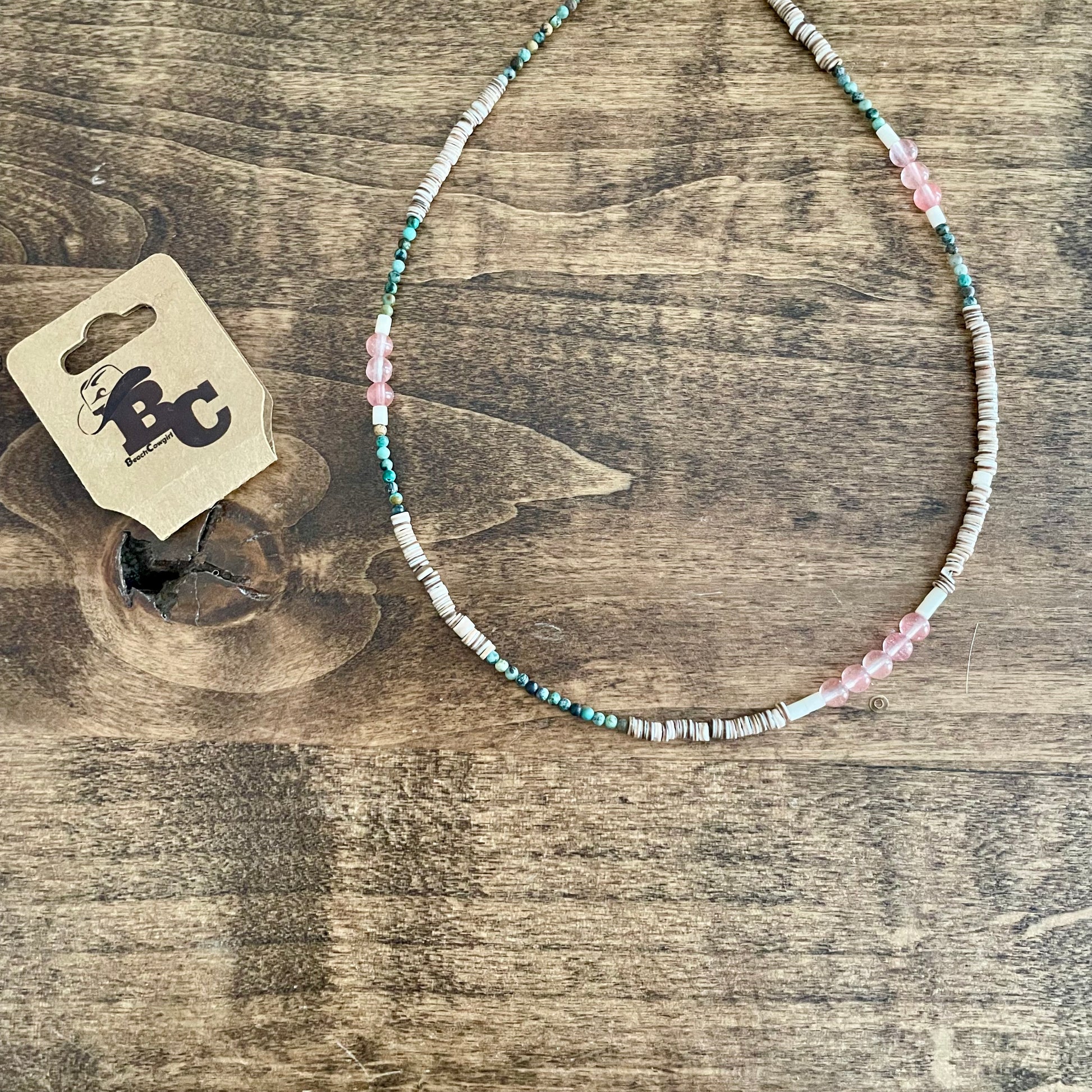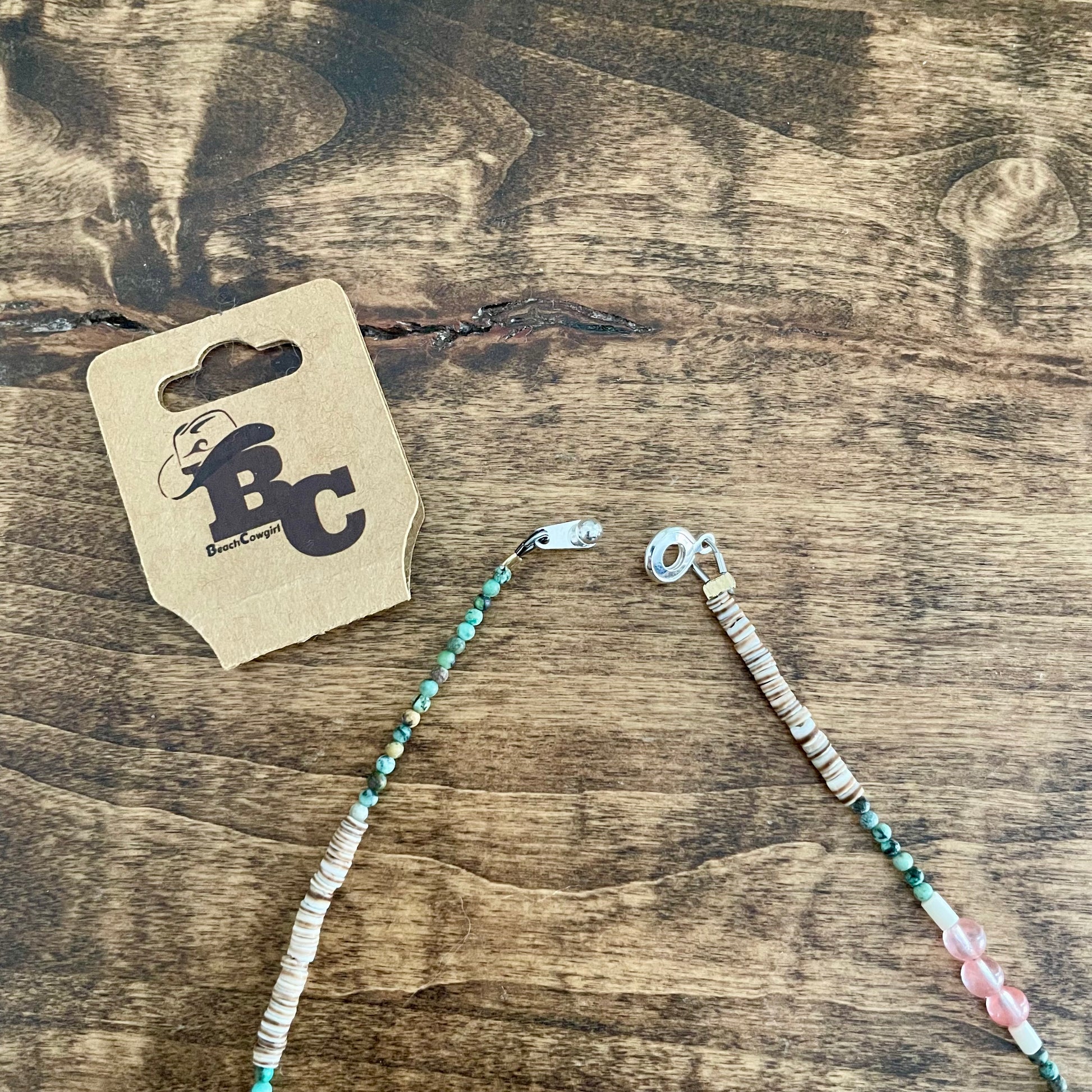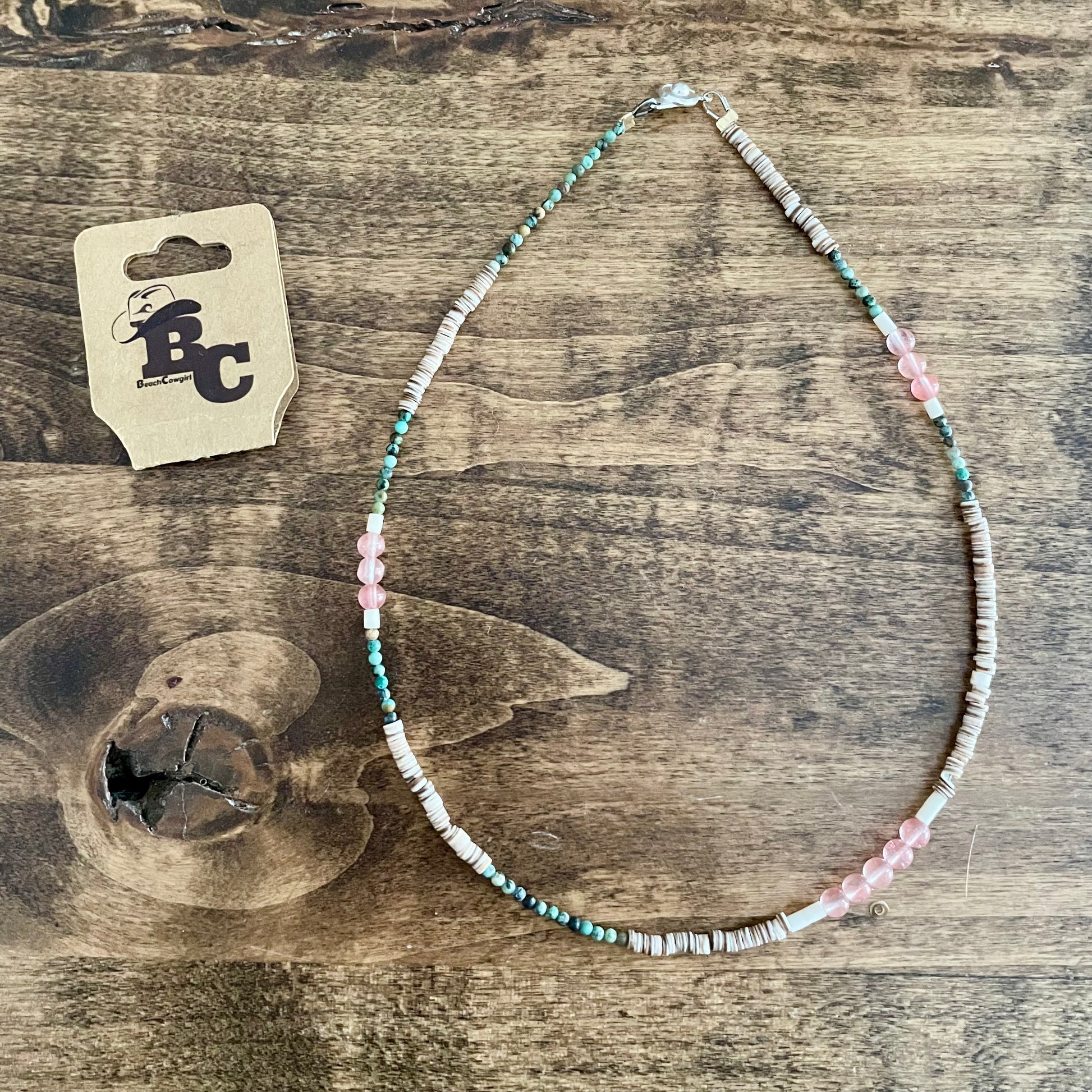 Beautiful handcrafted necklace! Made with stainless steel wire for extra durability and completely waterproof! Never have to take your jewelry off again! This necklace is made with all real stones! Turquoise, rose quarts, and pen shell! It has a unique button clasp that makes for easy on and off! Made to order, 15 inches.