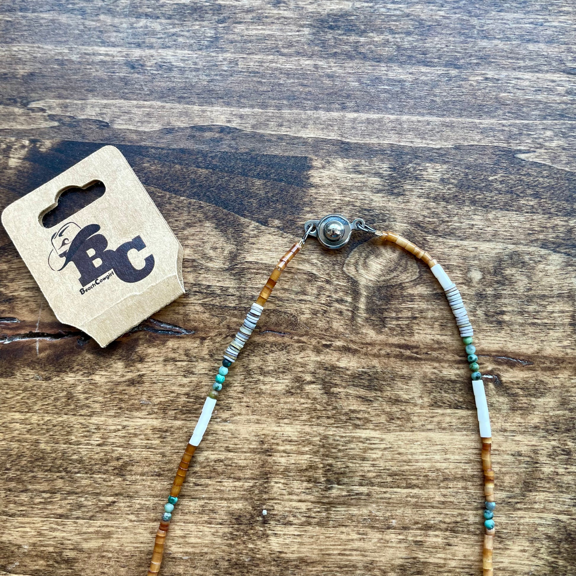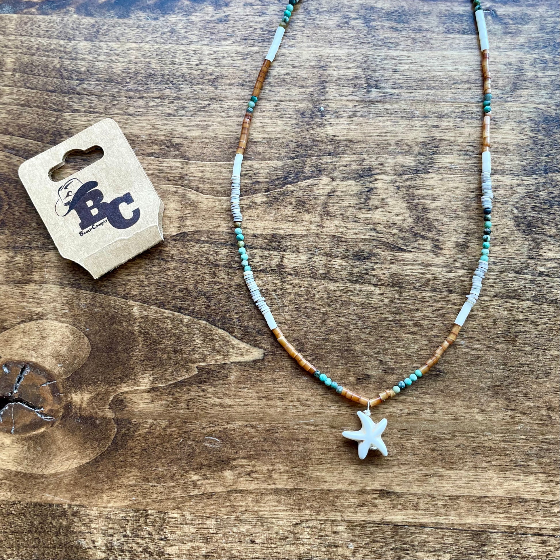 Beautiful handcrafted necklace! Made with stainless steel wire for extra durability and completely waterproof! Never have to take your jewelry off again! This necklace is made with all real stones! Turquoise and pen shell with a super cute starfish pendant! It has a unique button clasp that makes for easy on and off!
